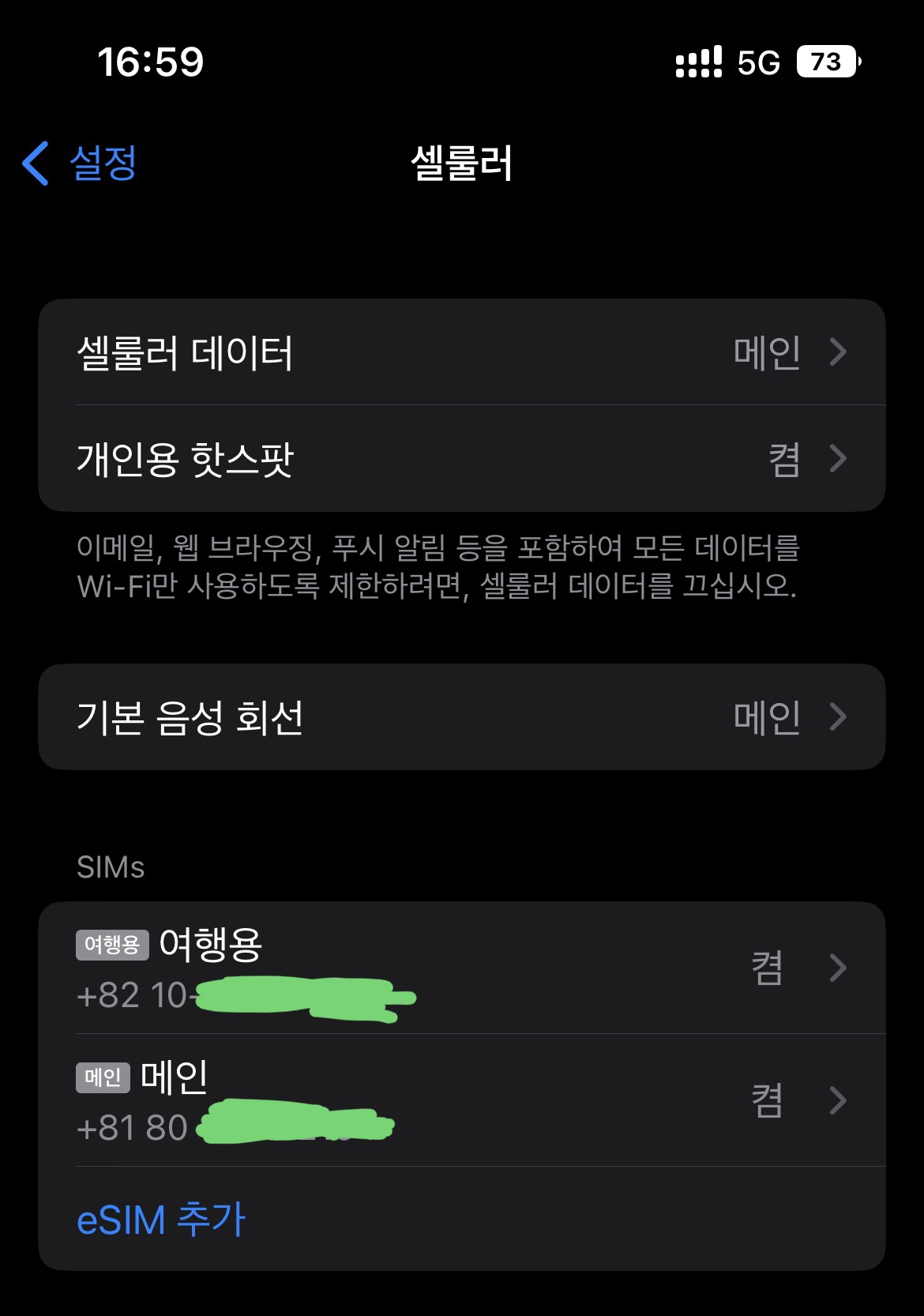 참고로 따로 설정 해줄것도 없이 eSIM 설정 후에 유심 꽂아 주시면 됩니다